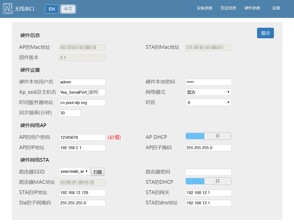 - Ap_ssid及主机名:AP模式下此设备发出的热点,可访问内置网页。